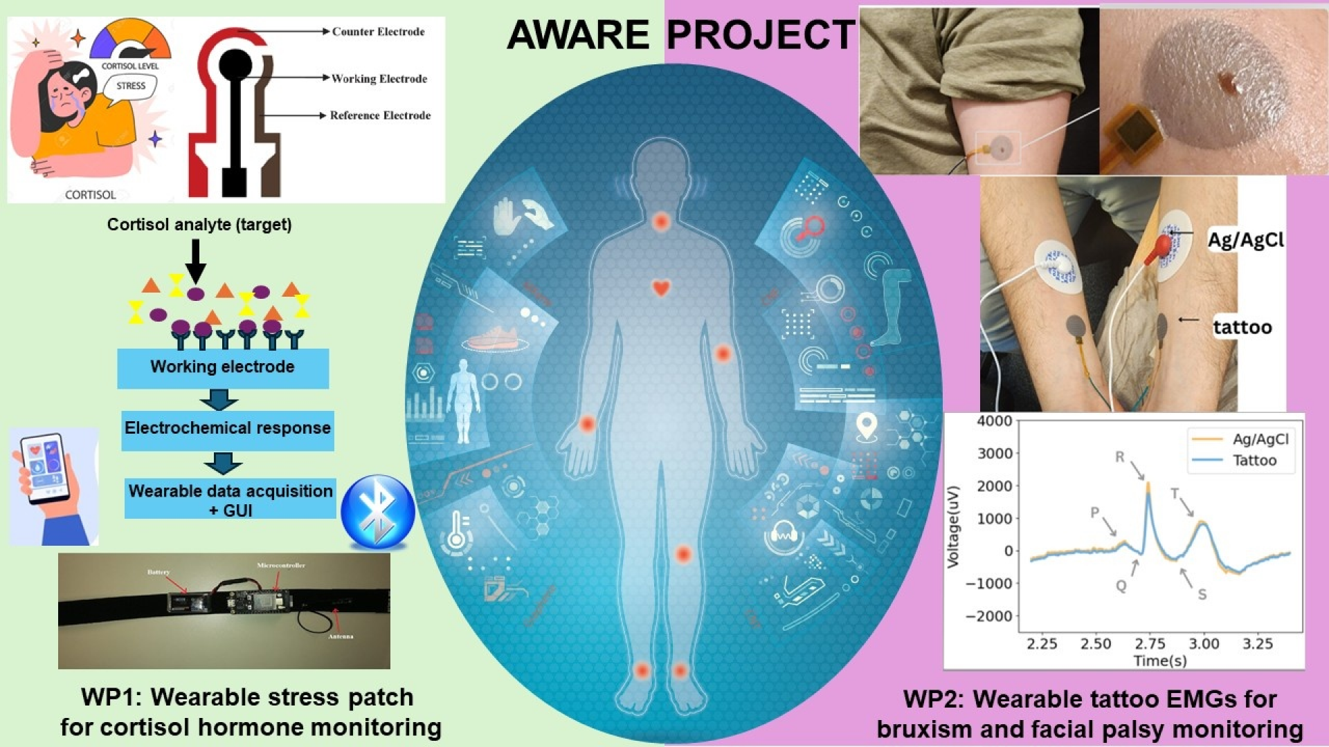 Het AWARE-project richt zich op kritieke vragen rondom onopvallende, realtime gezondheidsmonitoring. Kan cortisol in zweet betrouwbaar worden gemeten via een draagbaar apparaat op afstand, en kan zo'n zweetsensor discreet functioneren zonder op te vallen in sociale situaties? Daarnaast onderzoekt het project of bruxisme en aangezichtsverlamming continu gevolgd kunnen worden met laagimpedantie EMG-elektroden (zowel tijdens slaap als waaktoestand) voor een volledig beeld van symptoomprogressie.