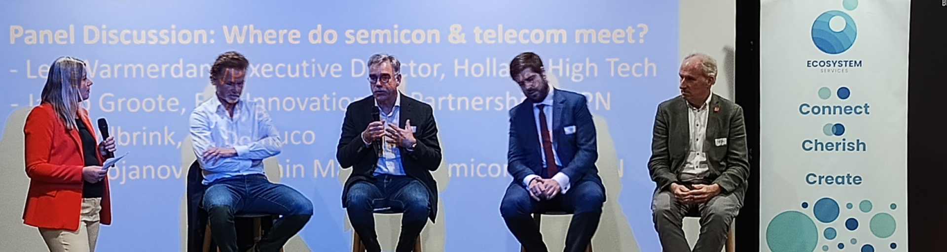 Aan het slot van de NL@MWC community bijeenkomst op de High Tech Campus Eindhoven worstelde een afsluitend panel met een eenvoudige vraag met ingewikkelde antwoorden: waar liggen de raakvlakken tussen semicon en telecom? Wat kunnen ze van elkaar leren en hoe maken ze elkaar sterker? De discussie, geleid door Anke Kuiper (Ecosystem Services), bracht Leo Warmerdam (Holland High Tech), Jacob Groote (KPN), Erik Wilbrink (Bruco) en Ivan Stojanovic (NXTGEN Hightech) samen. Hun oordeel: de overlap is overal – en er staat veel op het spel.